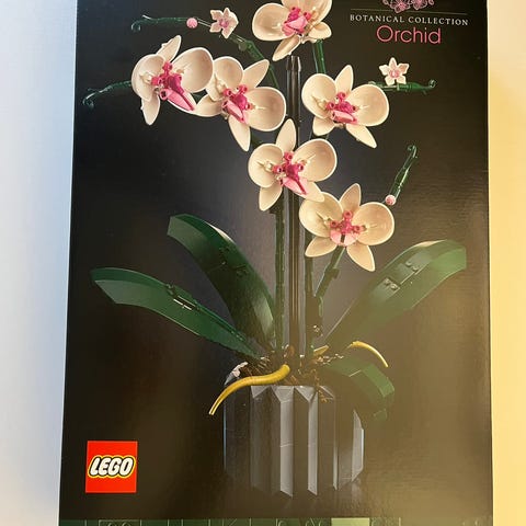 LEGO Botanical Collection Mini Orchid model. Indeholder detaljerede blomster og blade i LEGO-klodser, designet til at ligne en orkidé i potte. Velegnet til dekoration eller som samlerobjekt.