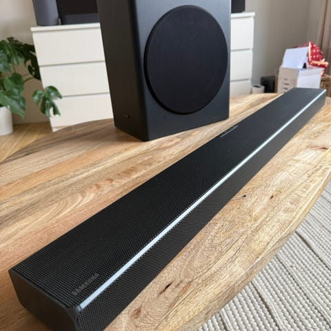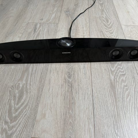 Samsung HW-K450 soundbar med trådløs subwoofer. Soundbaren er sort og designet til at forbedre lydoplevelsen ved tilslutning til tv eller andre enheder. Produktet inkluderer fjernbetjening til nem betjening af lydstyrke og lydindstillinger.