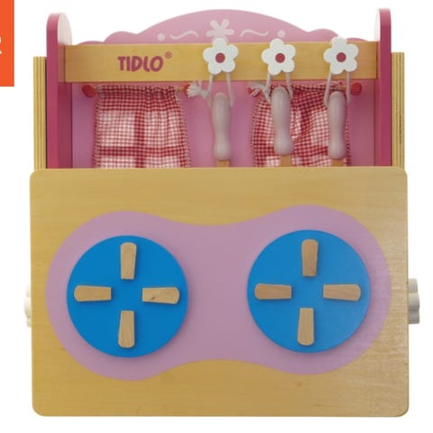 Solidt og pænt legekøkken i brune nuancer med ovn, kogeplader, vask og hylder. Giver masser af mulighed for kreativ leg og passer fint ind på børneværelset.