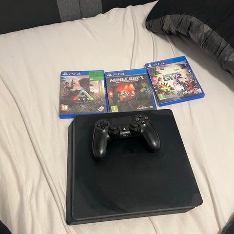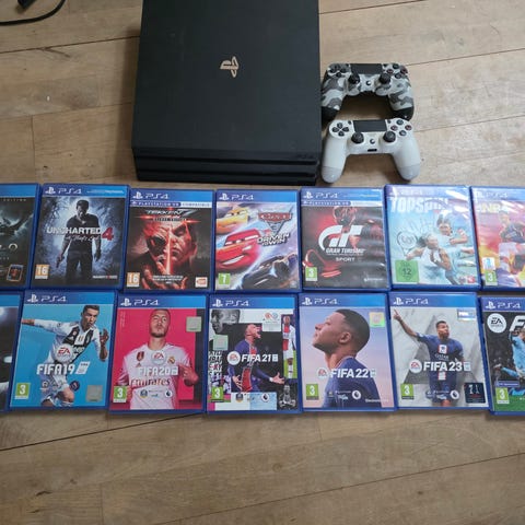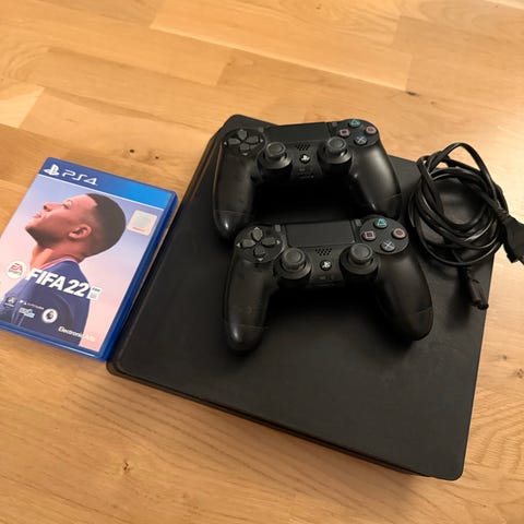 Playstation 4 spilkonsol inkluderer to controllere, nødvendige kabler til tilslutning samt to spil: FIFA 22 og FIFA 23.