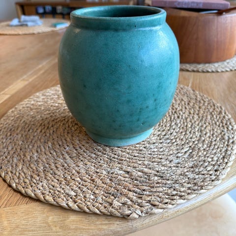 Saxbo Vase, go' størrelse, Keramik vase i grøn farve med rund form. Vasen har en glaseret overflade og en bred åbning.