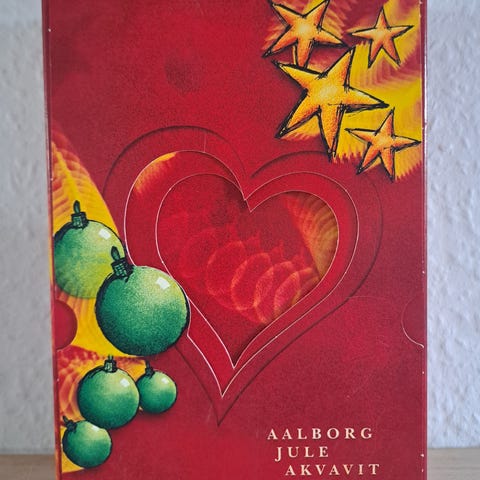 Aalborg Jule Akvavit flaske med original emballage. Flasken er lavet af glas og indeholder traditionel dansk juleakvavit.