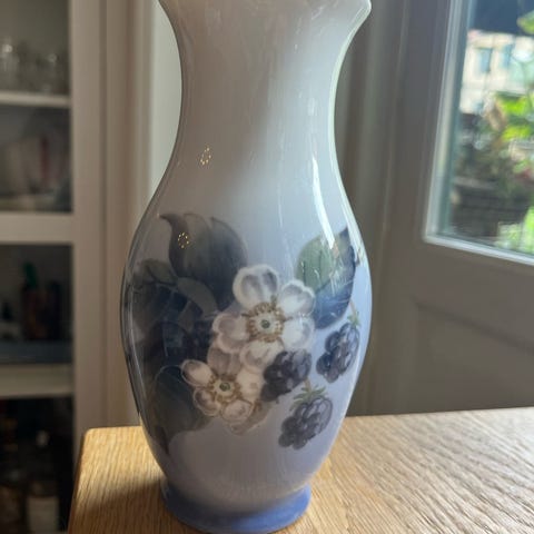 Porcelæn, Royal Cph 288 vase og lille fad, Royal Copenhagen, Lille vase i brombærserien 288 (4646) samt lille fad 288 (861). Vase måler 14,5 i højden og ca 6 cm i bredden er signeret SR, lille fad 17 cm i længden og 10,5 i bredden signeret ED. Betales kontant eller via Mobile Pay og afhentes på adressen (altså sendes ikke!)