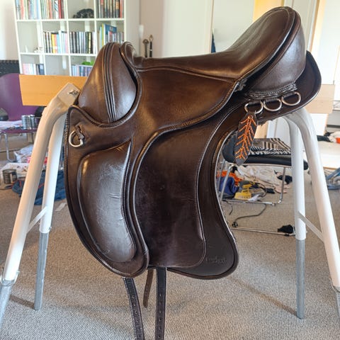 Jeg kan ikke se nogle fejl eller mangler på den, og det er en utrolig let sadel. Den sælges med originalt stigbøjleophæng og det åbne ophæng fra Barefoot, som den pt er monteret med.