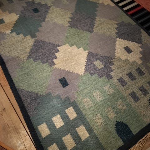 Fint lille håndvævet gulvtæppe eller løber i uld sælges for 575 kr. Det er et klassisk Rölakan eller et svensk moderne kelim. Det måler ca 67 x 130 cm inkl. frynser. Det er i fin stand uden pletter eller slid. Det kan sendes, men køber betaler portoen.