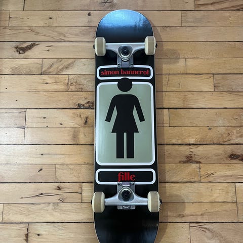 Girl Skateboards skateboard med grafisk design på undersiden. Skateboardet har hjul og trucks monteret, egnet til brug til skateboarding.