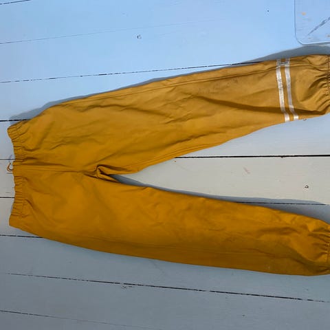 Mikk-Line Regnbukser børnebukser i størrelse 116, gul farve. Bukserne er designet til børn og har elastik i talje og benender for bedre pasform. Materialet er ikke specificeret, men bukserne er velegnede til udendørs brug.