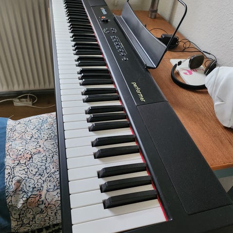 Sælger vores keyboard på stander og fodpedal. Der er påsat bogstaver så børn nemmere kan gennemskue noderne.