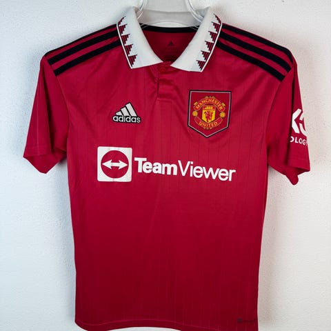 Str. 164. Manchester United Mbeumo 19 fodboldtrøje i rød farve med Premier League logo og 'No Room For Racism' patch på ærmet. Trøjen har detaljer som 'Theatre of Dreams' tekst ved kraven.