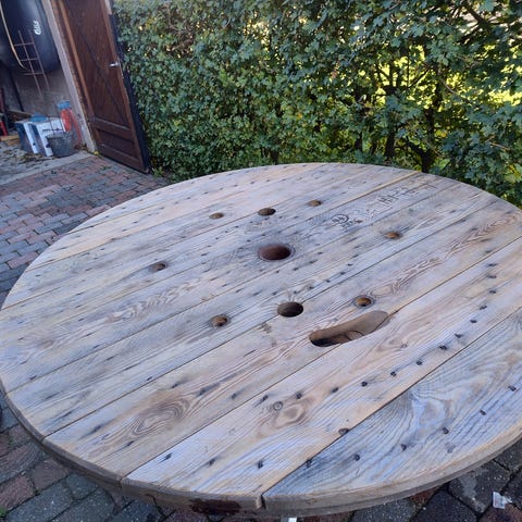 Med en diameter på 124cm og en højde på 74cm. Bygget af kabeltromler.dk, ca 5 år gammel, med stålben. Bordet er placeret i 4300 Holbæk