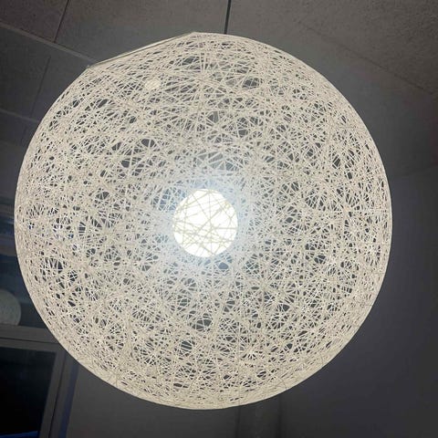 Kugleformet lampe lavet af hvidt trådmateriale. Lampen er designet til ophæng og skaber et dekorativt lysmønster på væggen. Passer til forskellige rum og indretninger.