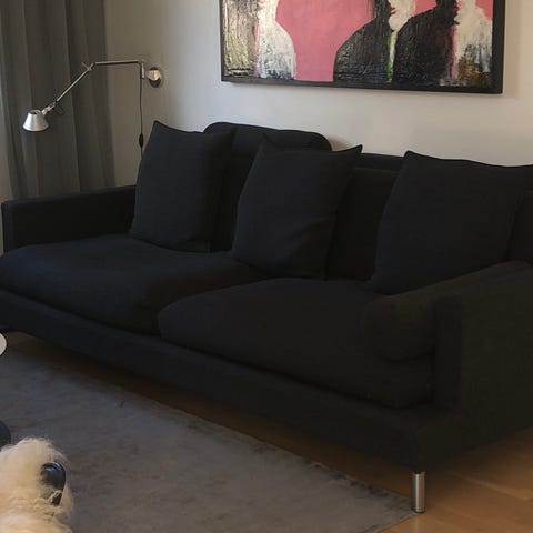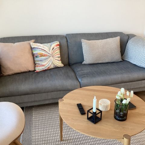 Eilersen sofa med puf, model Lift. Farven på stoffet er grå-nistret. Sofaen kan justeres i ryggen. Stoffet kan tages af og renses.
