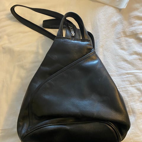 Lille Rygsæk med rund top. Justerbare skulderstropper. 2 frontlommer med lynlåse. Indvendig mobil og lynlåslomme. 27 x 22 cm.