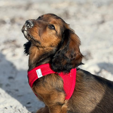 Min kæreste og jeg søger en langhåret merlefarvet gravhund