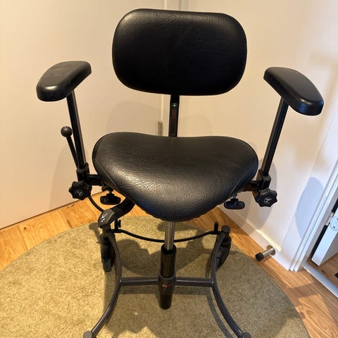 God ergonomisk saddelstol. Med hjul og fem ben så den er stabil (vælter ikke). Kan indstilles i højden. Betræk i sort stof. Kan vaskes. Fra ikke ryger hjem.