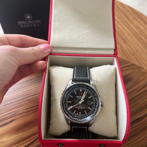 Super lækkert ur fra Swiss Military sælges. Uret fremstår i perfekt stand med ganske få brugs spor. Købte Uret for 3 år siden, men må konstatere at jeg ikke får det brugt. Uret måler 42mm og er super stilfuldt med den sorte rem og guld krans. Original box og papirer medfølger. Det skal ha et nyt batteri, da det bare har stået på hylden. Jeg gav selv 2800 kr . Modeller er udgået hvilket bare gør uret extra unikt