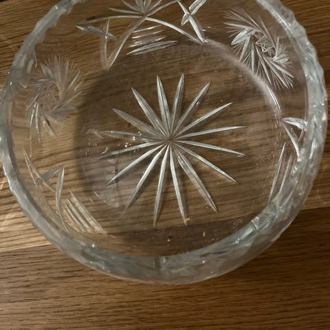 glas skål med dekorative detaljer. Skålen er fremstillet i klart glas og har en cirkulær form med mønstrede riller. Den står på tre små fødder, hvilket giver stabilitet. Velegnet til servering eller som dekorativ genstand.