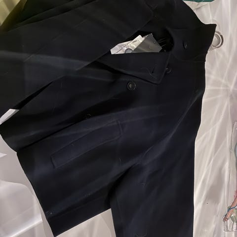 'S Max Mara frakke i uldblanding. Jakken er i let a-form og har dobbeltknappet frontlukning samt to stiklommer. Materialemærke er klippet ud. Str. 38, måler 69 cm i længden og 50 cm fra ærmegab til ærmegab. Meget fin stand.
