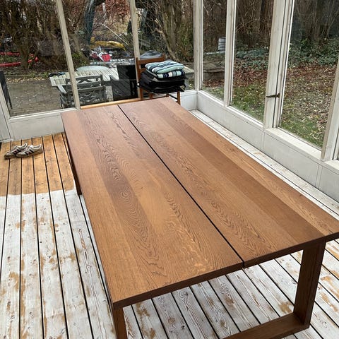 Spisebord fra IKEA. Fremstår i god stand, med små og enkelte brugsspor. Det er dette bord https://www.ikea.com/dk/da/p/moerbylanga-bord-egetraesfiner-brun-bejdse-50386245/