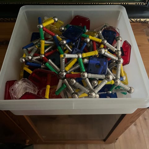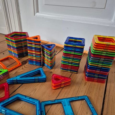 Geomag magnetisk byggesæt med forskellige former og farver. Sættet indeholder magnetiske firkanter, trekanter og sekskanter, der kan bruges til at bygge forskellige strukturer. Materialet er plast med indbyggede magneter. Velegnet til børn til leg og læring af magnetisme og geometri.