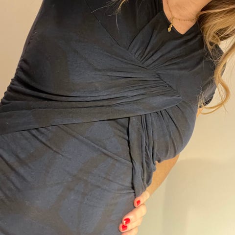 Stine Goya kjole, lyserød grå sort mønstret. Kropsnær model med drapering foran ved brystet. Størrelse M til kvinder. 95% modal, 5% elasthan