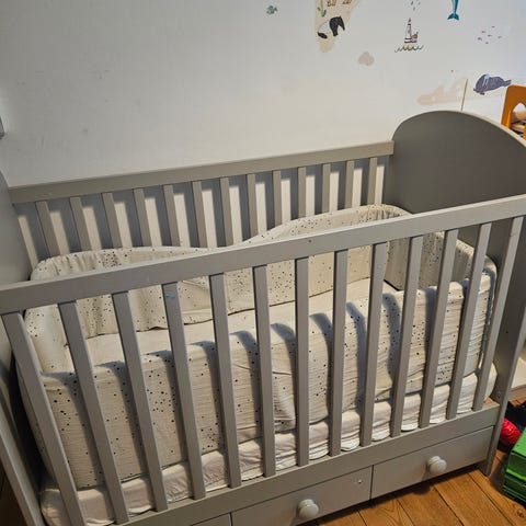God tremmeseng med to rummelige skuffer under til sengetøj eller lignende. Madras, topmadras og sengerand fra Vanilla medfølger.