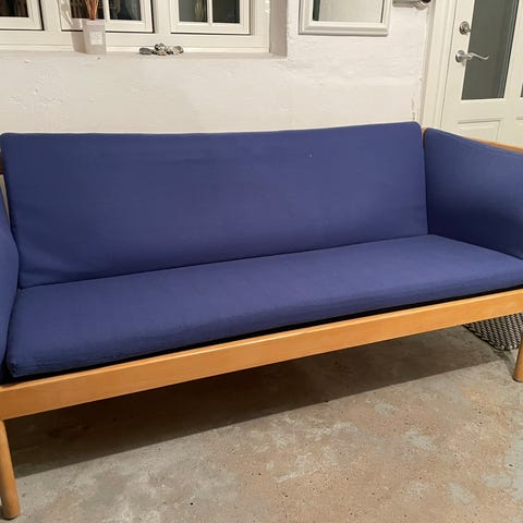 Sofaen og stol leveres i blåt stof med lysblå striber. Stoffet er skiftet. Sofaen er fra start 1980erne og fremstår med patina. Armlæn på stol har slid mærker. God sidde komfort.