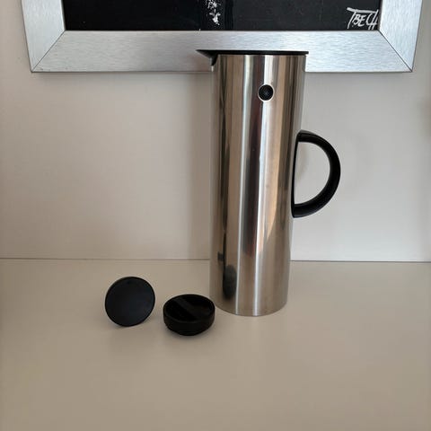 Stelton EM77 ELKEDEL i hvid med sort låg og håndtag.MAX. 15 LITER. Kanden har en klassisk cylindrisk form og er pæn og i orden. Den er udstyret med en praktisk åbning i låget til nem påfyldning og hældning.