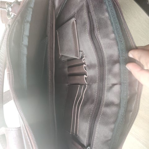 Solid med 2 kraftige læderhåndtag samt skulderrem. Kraftige hængsler, så den holder. Lynlåsrum udvendigt, indvendigt god plads med fast bund samt 1 lynlåsrum og 1 åbent.