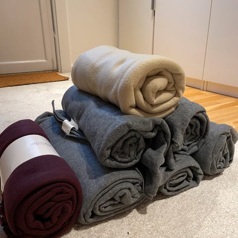 Skønt stort fleece tæppe; perfekt at putte sig i på en kold aften. Kæmpestort, måler 200 x 145 cm. Tofarvet - så rød på den ene side og mørkerød på den anden. (Er egentlig beregnet til yogatæppe, så det kan det også bruges til) 100% polyester.