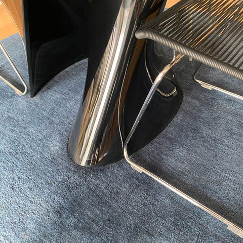 Flot, moderne spisebord med rund, sort glasbordplade og metalstel. Brugt, men i rigtig god stand. Sælges udelukkende på grund af flytning. Hurtig afhentning prioriteres. Skriv for mere info!