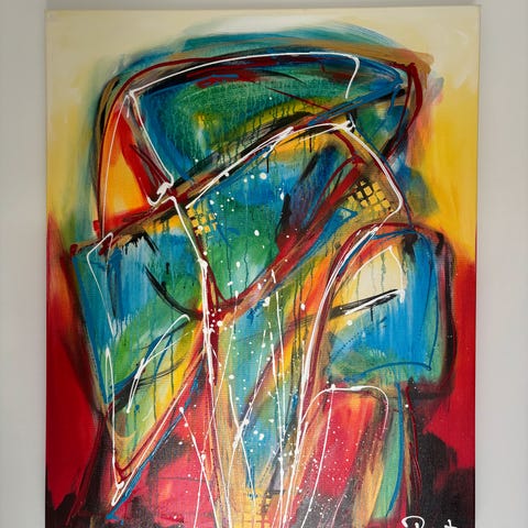 Abstrakt maleri med dominerende varme farver som rød, gul og orange. Maleriet indeholder dynamiske og ekspressive penselstrøg og former, der skaber en levende og energisk komposition. Velegnet til dekorative formål i moderne indretning.