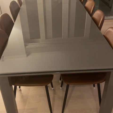 Spisebord med fantastisk stell og 2 tillægsplader. hver tilægsplade er 50 cm, så bordet kan forlænges til 3 m og der kan nemt sidde 12 personer omkring bordet i fuld størrelse.