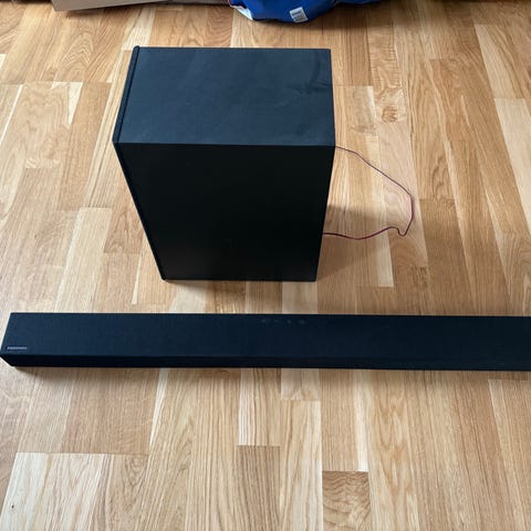 Samsung HW-A440 2.1ch Soundbar (2021) med en trådløs subwoofer og fjernbetjening.
