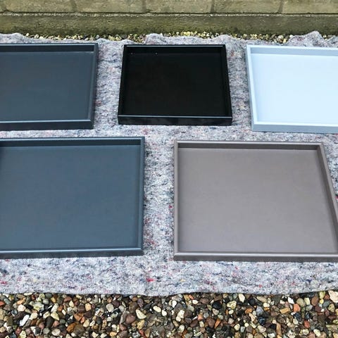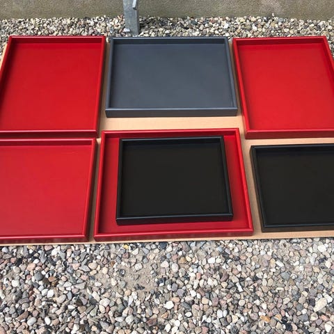 ARRANGE trays der er produceret i 12mm MDF, der er lakeret med vandbaseret lak, jeg har dem i følgende farver - med de her mål: