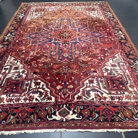 Håndknyttet Heriz orientalsk tæppe fra Pakistan, størrelse 300 cm × 196 cm, uld på bomuld, generelt i god stand, fremstillet i slutningen af det 20. århundrede. Klik på den blå "gå til varen" knap, for at købe eller byde på denne vare. Den samlede pris vil blive vist inden du afgiver dit bud.