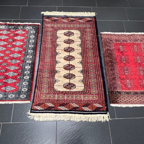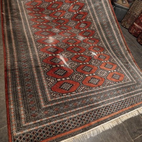 Vi præsenterer for Dem et enestående, håndknyttet Buchara-orientteppe fra Pakistan – et sandt mesterværk inden for tæppekunst.
