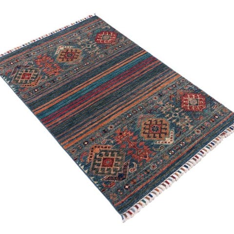 Dette elegante håndknyttede designer tæppe fra Pakistan imponerer med sit traditionelle Samarkand-mønster, kombineret med varme, livlige farvetoner. De harmoniske striber veksler med detaljerede geometriske ornamenter og skaber en stilfuld komposition, der både pryder moderne og klassiske rum.