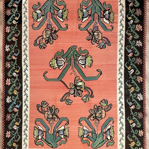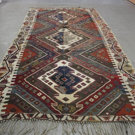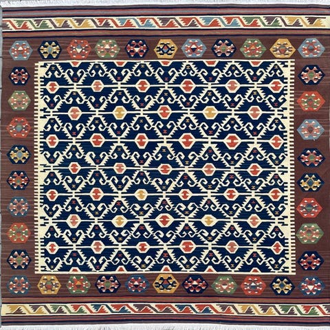 Kazak kelim håndvævet uld tæppe, oprindelse Tyrkiet, 300 cm længde og 269 cm bredde, to sider med forskellige farver, professionelt renset, 21. århundrede. Klik på den blå "gå til varen" knap, for at købe eller byde på denne vare. Den samlede pris vil blive vist inden du afgiver dit bud.