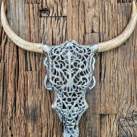 Et håndgraveret ko skull, graveret af håndværkere, der har videreført den gamle kunst af gravering fra far til søn. Skallen er fuldstændig håndskåret med stor omhu. Det er et usædvanligt, dekorativt stykke.