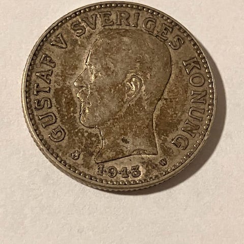 10 2-kroner i sølv, Sverige 1942 til 1950, uhævede med et ekstra 1950 med dobbeltstemplede ts som vist på billede 3. Mønterne har billede af den svenske konge Gustav V.