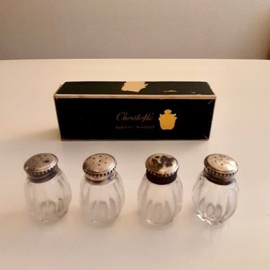 Krydderisæt Christofle Fleuron, belagt med sølv, vintage, bestående af 2 ampuller og 2 saltkar, i god stand, ingen skår eller manglende dele. Nogle brugstegn, som det kan ses på billederne.
