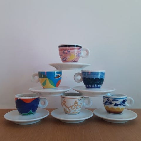 Set illy-kopper samling designet af Michelangelo Pistoletto, begrænset og nummereret serie, sæt med 6 kaffekopper, aldrig brugt, med originalemballage.