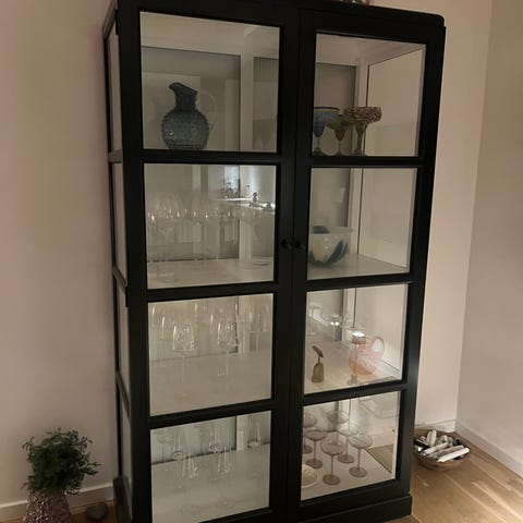 Vi har netop modtaget skabet, og det er fortsat i oprindelig emballage. Skabet er meget smukt, men passer desværre ikke i vores køkken. Der er glashylder bag glaskålene, og lys til montage i skabet. Skabet står på en sokkel.