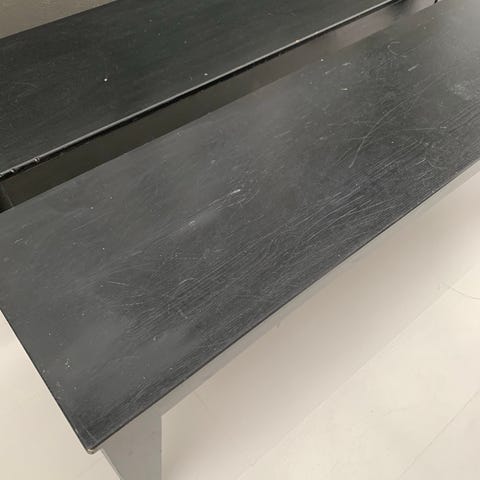 Fin bænk/bord, som kan have 2 bogkasser med hjul under.