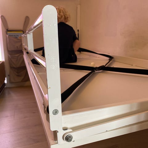 Det er helt fint stand. Bamse Boet er håndlavet i 9 mm. birkekrydsfiner med elastiksnor, så det er nemt for selv de mindste børn at få bamserne ind og ud af deres nye hjem.