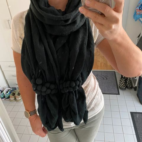 Rigtig pæn tørklæde sort/grå/meleret, str. 54 x200 cm + frynser.