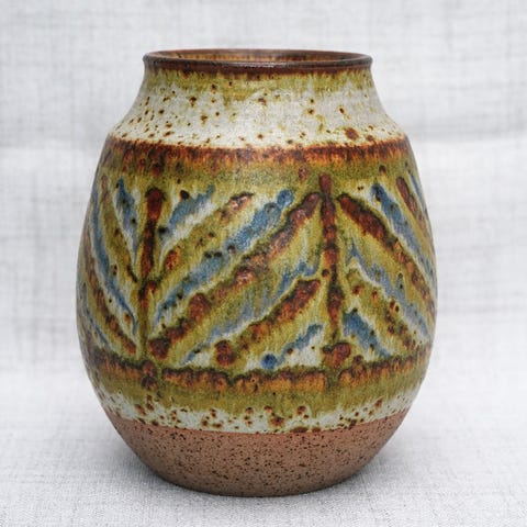 Fin løgformet vase af stentøj delvis dekoreret med olivengrøn glasur. Formgivet af Marianne Starck for Michael Andersen. H. 12 cm.