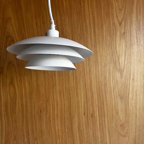 Hvid opalglas. Baldakin i stål. Diameter 50, højde 17cm. Kan bruges med lysdæmper.