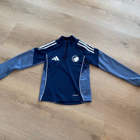 Adidas FC København fodbold træningstrøje til børn i størrelse 140. Trøjen er sort med hvide striber langs ærmerne og FC København logo på brystet. Fremstillet i performance materials, designet til sport og træning.